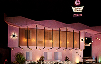 Description:North Hollywood, CA. Fabulous Flamingo Motel (6105 Lankershim Blvd.), hosts: Mr. and Mrs. Harold Elsner. Night exterior of stucco motel with rippling roof and neon sign.