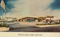 Description:Van Nuys, CA. Enco Car Care Center (7155 Van Nuys, CA), watercolor rendering of the lot and service station. Postmarked 1970, Van Nuys.