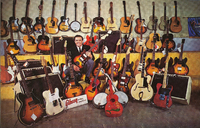 Description:Tarzana, CA. Ernie Ball Guitars (19501 Ventura Blvd.), smiling man in showroom, surrounded by guitars, amplifiers, and a few banjos!