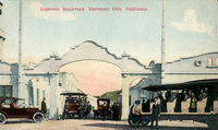 Description:Universal City, CA. "Laemmle Boulevard, Universal City, California." Entrance to Universal City Studios with cars and tour coaches.