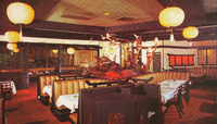 Description:North Hollywood, CA. Far East Terrace (4227 Lankershim Blvd.) interior, featuring yellow/white Chinese lanterns, gold satin booths, central diorama with models of birds.