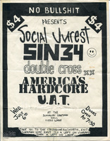 Description:Flyer for No Bullshit’s show with Social Unrest, Sin 34, Double Cross, America’s Hardcore, and U.A.T at the Sun Valley Sportsman Hall. The flyer is hand-drawn.