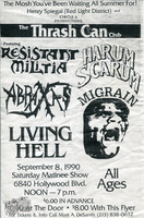 Description:Flyer for Henry Spiegal (Red Light District) and Circle A Productions’ The Thrash Can Club. The show featured Resistant Militia, Harum Scarum, Abraxas, Migrain, and Living Hell on Hollywood Boulevard. The flyer was printed on a halfsheet of paper.