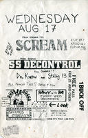 Description:Flyer for Scream, SS Decontrol, Dr. Know, Stäläg 13 at Shamus O’Brian’s in August 1983. The flyer is hand-drawn on a half sheet of paper.