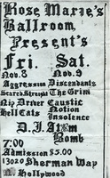 Description:Flyer for Rose Marie’s Ballroom advertising 2 shows in Hollywood: Friday with Agression, Scared Straight, Nip Drivers, and Hell Cats. And Saturday November 9th with Descendants, The Grim, Caustic, Notion, and Insolence. The flyer has black hand-drawn gothic letters on 8 by 14 inch blue paper.