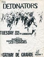 Description:Flyer for The Detonators with Patriots, Hated Principles, and Lazy Cowgirls at Cathay De Grande in October 1983. The flyer was printed on 8.5 by 11 inch paper.