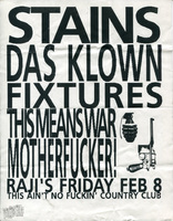 Description:Flyer for Stains, Das Klown, Fixtures, This Means War, and Motherfucker! at Raji’s in February 1985. The flyer is all black text with a gun and a grenade printed.