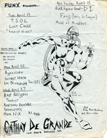 Description:Flyer for P.U.N.X’s show “A Night in the Pit” with Abandoned, Battalion of Saints, Circle One, Personal Conflict, Vandals, Würm, and MIA. Hand-drawn with black ink on beige paper.