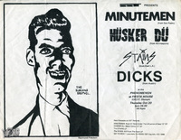Description:Flyer for SST’s show for Minutemen (from San Francisco), Husker Du (from Minneapolis), Stains (from East L.A), Dicks (from Austin) at the Phenomenon at Fiesta House in 1983. On the left side there is a drawing by Raymond Pettibon, on the right side the printed text on white paper.