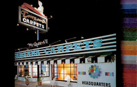 Description:Tarzana, CA. McQueen's Tarzana Carpets (18584 Ventura Blvd.), night view of storefront with Aladdin-on-a-flying-carpet neon sign and a rainbow of carpet samples.