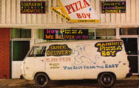 Description:Canoga Park, CA. Mancini's Pizza Boy (8319 DeSoto Ave. at Roscoe) exterior with white delivery van painted with delivery boy logo outside.