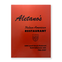 Description:Menu from Aletano’s Italian-American Restaurant located at 6304 Laurel Canyon Blvd., North Hollywood. The owner was John Aletano, Sr. Aletano’s moved to Laurel Canyon Blvd. location from 4334 Matillija, Sherman Oaks, in 1964. Joe Aletano had retired in 1962 and moved to the Bay Area, but he came back and started up again. His whole family worked there. It remained open at least as late as 1977. [show more]