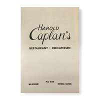 Description:Small menu from Harold Caplan’s Restaurant [&] Delicatessen, a Jewish Deli located at 18635 Devonshire, Northridge.