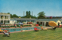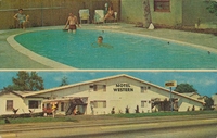 Description:Van Nuys, CA. Motel Western (6719 Sepulveda Blvd.), two photos: view of pool area with guests swimming and relaxing; street view of motel with low sloping roof.