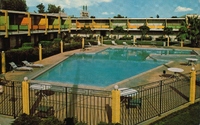 Description:Van Nuys, CA. Monticello Motor Court (8071 Sepulveda Blvd.), outdoor view of motel guests swimming and sunbathing at the pool.