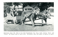 Description:Van Nuys, CA. Mr. Glick of Bird Wonderland (see VR/PC/EH/4) in a cart pulled by two male lions, King and Tarzan, “the famous team of movie lions.”