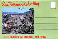 Description:Postcard booklet from the San Fernando Valley, including Burbank and Glendale. 12 postcards including street scenes, Lockheed air terminal, NBC studios, Warner Bros. Studios, the San Fernando Mission, and Glendale.