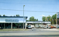 Description:Reseda, CA. Michelmore Motors (VW and Porsche dealer) (6957 Reseda Blvd.), street view of car showroom and lot full of 1960s Volkswagens.