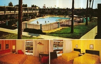 Description:Mission Hills, CA. Mission Hills Inn (10621 Sepulveda Blvd.), three images: pool area; interior queen bedroom; interior twin bedroom with yellow spreads.