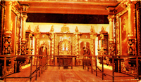 Description:San Fernando, CA. Mission San Fernando Rey de Espana (15151 San Fernando Mission Blvd., Mission Hills today). Blurry interior photo of "famous escary collection of hand-carved altars, respledent in gold-leaf, 17th century."