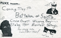 Description:P.U.N.X’s flyer for Battalion of Saints (from San Diego), Circle One (from Los Angeles), Whipping Boy (from San Jose),Stäläg 13 (From Oxnard), Manifest Destiny. The flyer is handwritten a half sheet of paper.