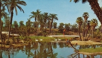 Description:Busch Gardens, Van Nuys, CA. View of Palm Island featuring Mute Swans and various macaws (parrots).