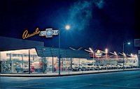 Description:Reseda, CA. Rancho Chevrolet (7056 Reseda Blvd.), night view of car showroom with rooftop neon sign. ("Same Location Since 1954")