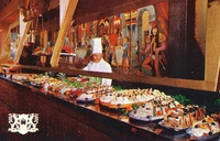 Description:Encino, CA. Queen's Arms Restaurant (16325 Ventura Blvd.) interior, featuring buffet table with various molded salads. Mural of medieval banquet in background.