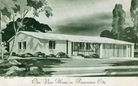 Description:"Our New Home in Panorama City." Greenish image of a large ranch-style home with attached 2-car garage. Possibly a real estate souvenir.