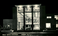 Description:Burbank, CA. Public Service Department Building (164 W. Magnolia Blvd.; Burbank Water & Power today). Night view of building, illuminated to show Art Moderne (Art Deco) reliefs representing "Water, Light, Power" and interior mural by Hugo Ballin (1948) representing the same themes. [show more]