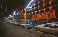 Description:Reseda, CA. Rancho Chevrolet (7056 Reseda Blvd.), night view of used car lot featuring "Green Hot Specials!" ("Same Location Since 1954")