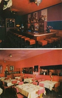 Description:Northridge, CA. Sasha's Palate Shishkebab Restaurant (8438 Reseda Blvd.), two interior views: cocktail bar with red leather stools; dining room with pink chairs.