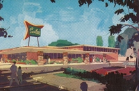 Description:Burbank, CA. Sailee's (Olive St. at Alameda, opposite NBC TV). Painting of exterior showing "Googie" architecture features such as projecting roof supported by stone pylons.