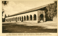 Description:San Fernando, CA. San Fernando Mission, est. 1797. Galleried walkway. "Where the Cahuenga Treaty was performed between General Fremont and the last Mexican governor Pio Pico."