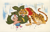 Description:Sambo's Restaurant (multiple San Fernando Valley locations). Cartoon of Sambo and Tiger mascots: "Sambo's Pictre Story Series. Sambo meets a tiger in the jungle. The tiger demands Sambo's little red jacket."