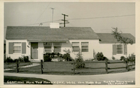 Description:"Greetings from the Mahnkens', 6602 Van Nord [sic] Ave. North Hollywood California. Black and white photo postcard of a single-story home. Actually 6602 Van Noord Ave., at the corner of Van Noord and Kittridge, built in 1947.
