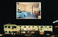 Description:Sherman Oaks, CA. Sierra Lodge Motel (4781 Sepulveda Blvd.), night photo of street view of motel, pine tree decoration, neon sign; inset of bedroom with baby blue spreads.
