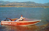 Description:Sepulveda (North Hills), CA. Sepulveda Boat Dock (9006 N. Sepulveda Blvd.), "Home of the Brendella." Man (possibly Irv Brendel) in a late 1950s wood Brendella ski boat at the Hansen Dam.