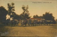Description:Lankershim, CA. "Shipping Walnuts, Lankershim, Cal." (North Hollywood today). Six two-horse carts standing in a field, loaded high with sacks of walnuts. Postmarked June 13, 1912, Lankershim.