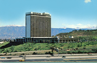Description:Universal City, CA. Sheraton-Universal Hotel (333 Universal Hollywood Dr., today), color photo of high-rise hotel showing closeness to freeway. Depicts snow on the mountains in the background.