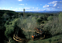 Description:Valencia, CA. Six Flags Magic Mountain. Aerial view of the Gold Rusher roller coaster.