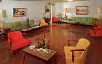Description:Van Nuys, CA. Sepulveda Convalescent Hospital (5510 Sepulveda Blvd.), "most modern facilities . . . 15 minutes from Beverly Hills!" Interior of a lobby/waiting room with brightly-colored furniture.