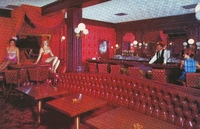 Description:Sherman Oaks, CA. Stanley Burke's Corker Room (5043 Van Nuys Blvd.) interior, featuring bar, red brocade wallpaper, huge red leather bench seating, and two women dressed as showgirls.