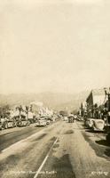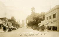 Description:Lankershim, CA. Street scene from the 1910s with storefronts and numerous early cars. Handwritten arrow on front: "Looking towards L.A." North Hollywood was known as Lankershim from 1896-1927.
