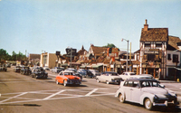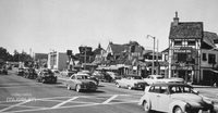 Description:Street scene, Encino, CA. Ventura Blvd. with faux Tudor shops and businesses.