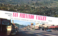 Description: Street scene, Studio City, CA. Two photos separated by banner text: "Greetings from San Fernando Valley, Calif. The Fastest Growing Area of Los Angeles. Top photo: aerial view of Valley homes. Bottom photo: Photo of Ventura Blvd., Studio City, from VR/PC/SS/18. There are two duplicates (VR/PC/SS/19a and b). [show more]
