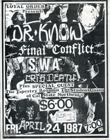 Description:The Loyal Order’s flyer for Dr. Know, Final Conflict, SWA, Crib Death and “special guest,” at the Tapestry Room at California State University Northridge in April 1987. The flyer is collage style, printed on 8.5 inch by 11 paper.