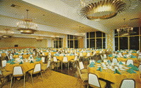 Description:Mission Hills, CA [Granada Hills today]. The Odyssey Restaurant (15600 Midwood Dr.) interior of the Apollo Ballroom, featuring gigantic gold chandeliers, gold tablecloths, and turquoise napkins.