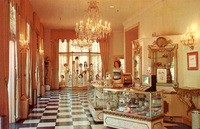 Description:Universal City (Studio City), CA. The Cinematique Glamour Pavilion, where "live makeup shows" were performed at the Universal City Studios "Upper Lot," presumably for tourists. Interior of a fancy room with a beauty counter and display of wigs. [show more]