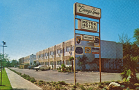 Description:North Hollywood, CA. The Hollywood Parkway Motor Lodge (11034 Ventura Blvd. (US 101), street view of white motel with drive-in entrance, neon cursive lettering, old-fashioned streetlamp.
